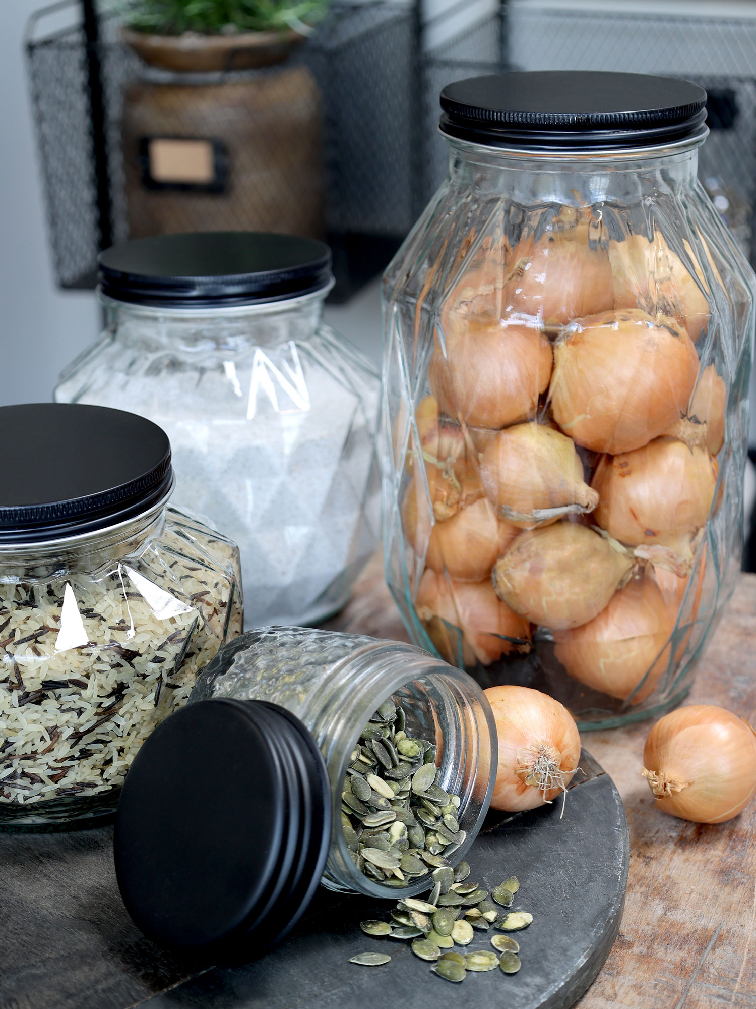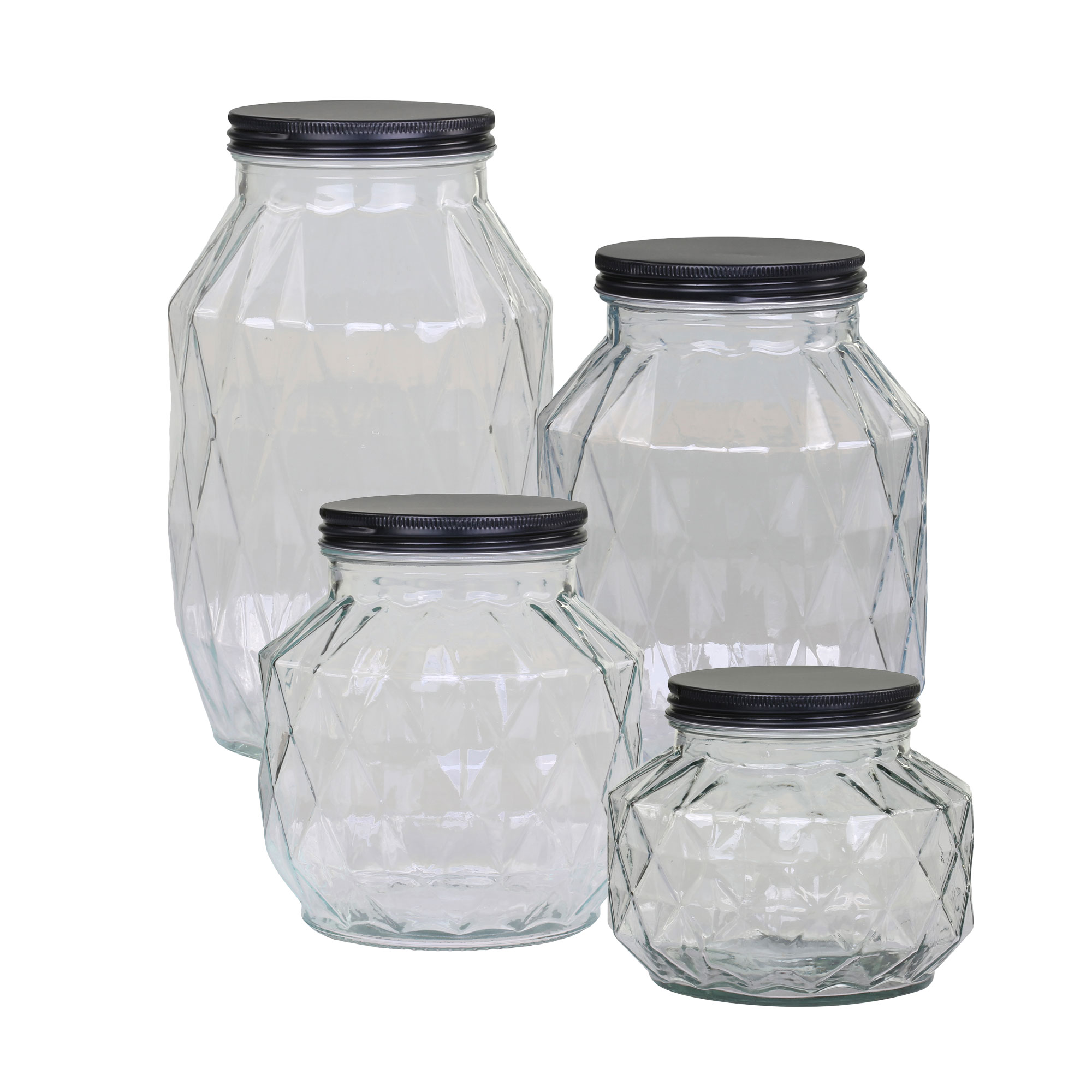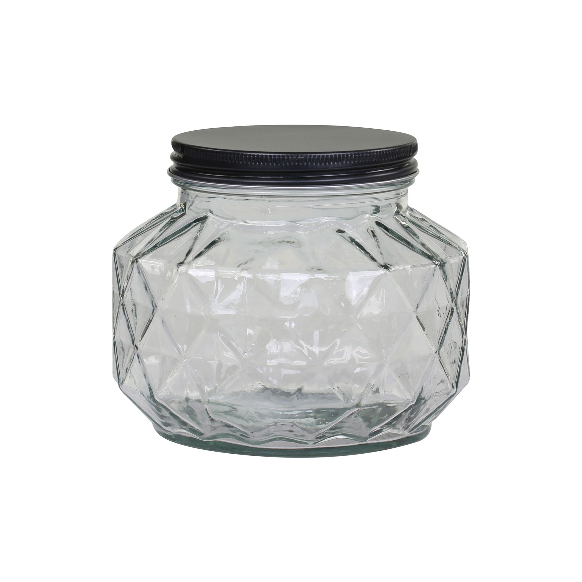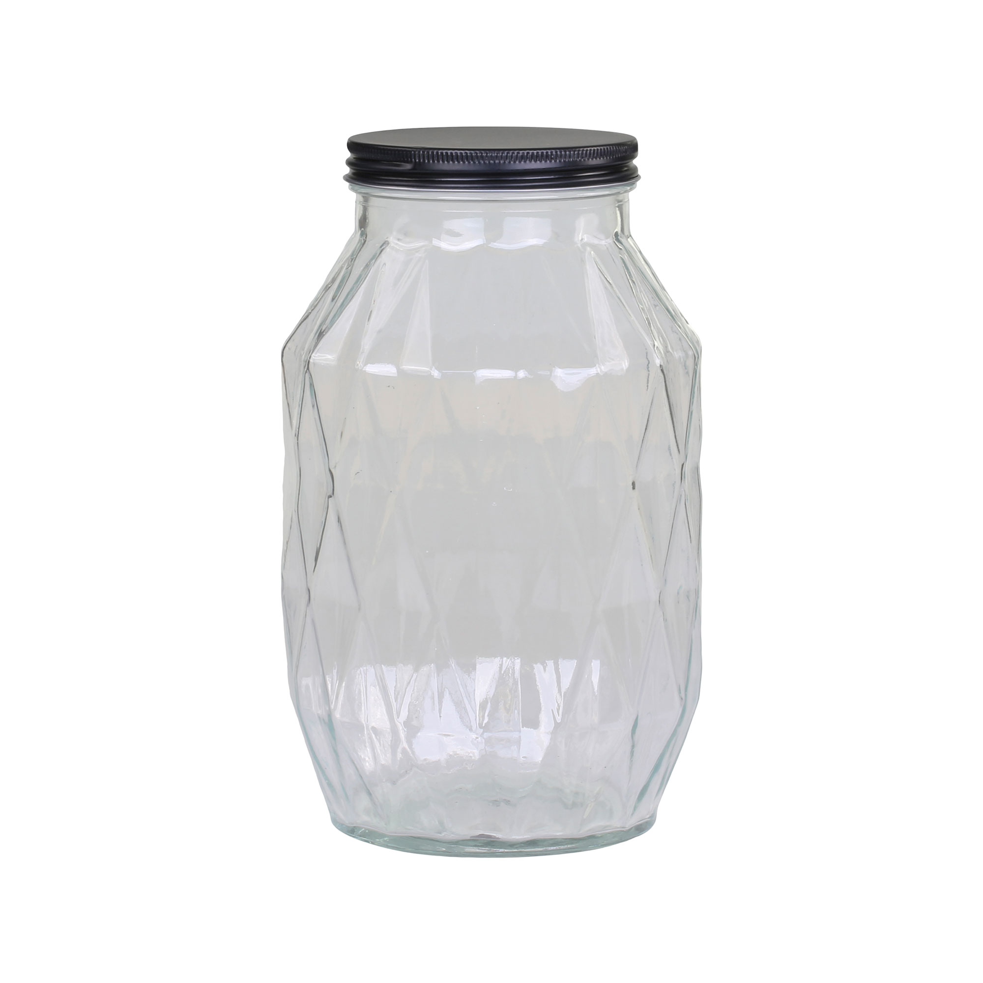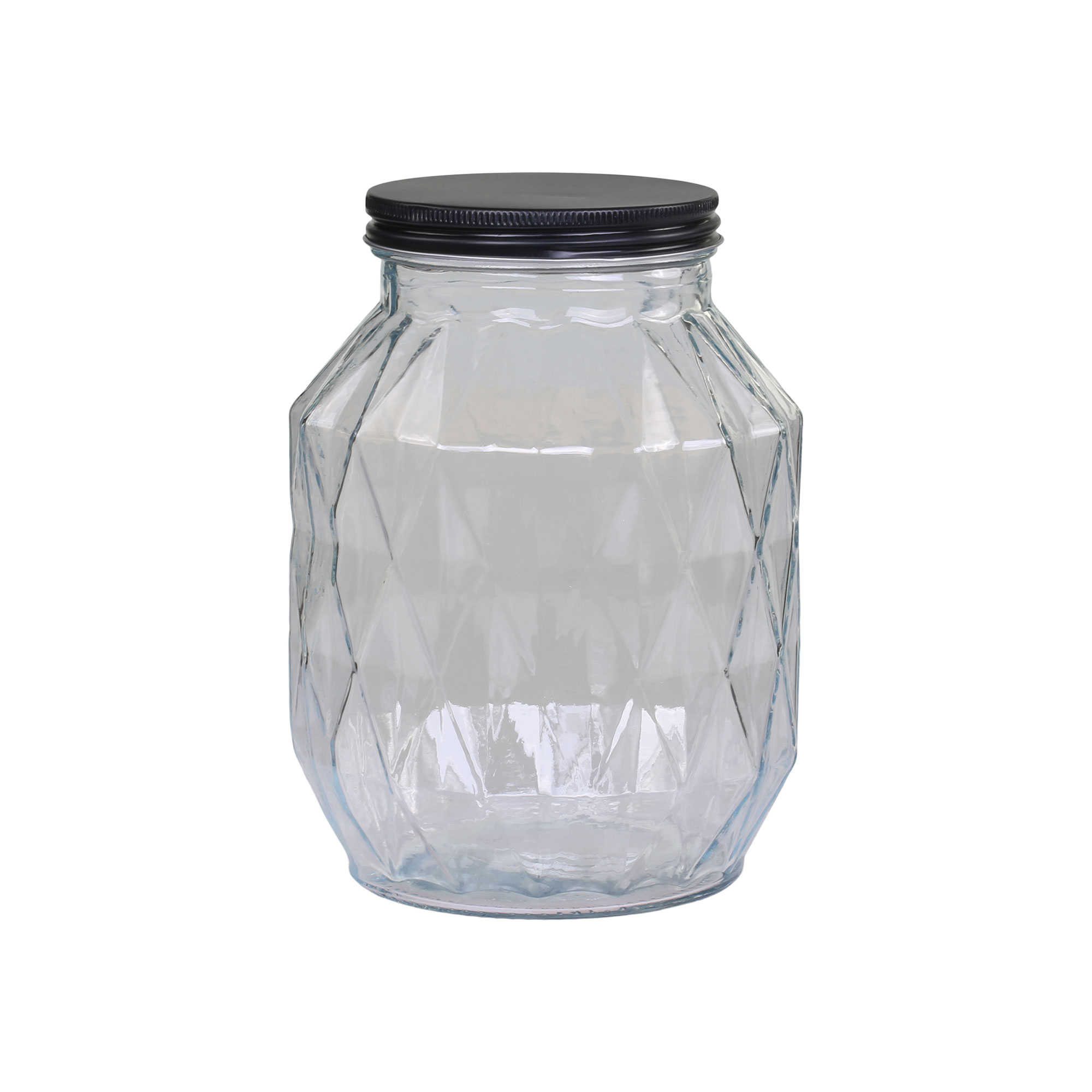 Ces bocaux en verre au relief géométrique apportent une touche graphique et contemporaine à la cuisine. Leur design facetté met en valeur le contenu tout en structurant visuellement les étagères et plans de travail. Le verre transparent permet une lecture immédiate des aliments, tandis que le couvercle en métal noir crée un contraste élégant et assure une fermeture pratique au quotidien.