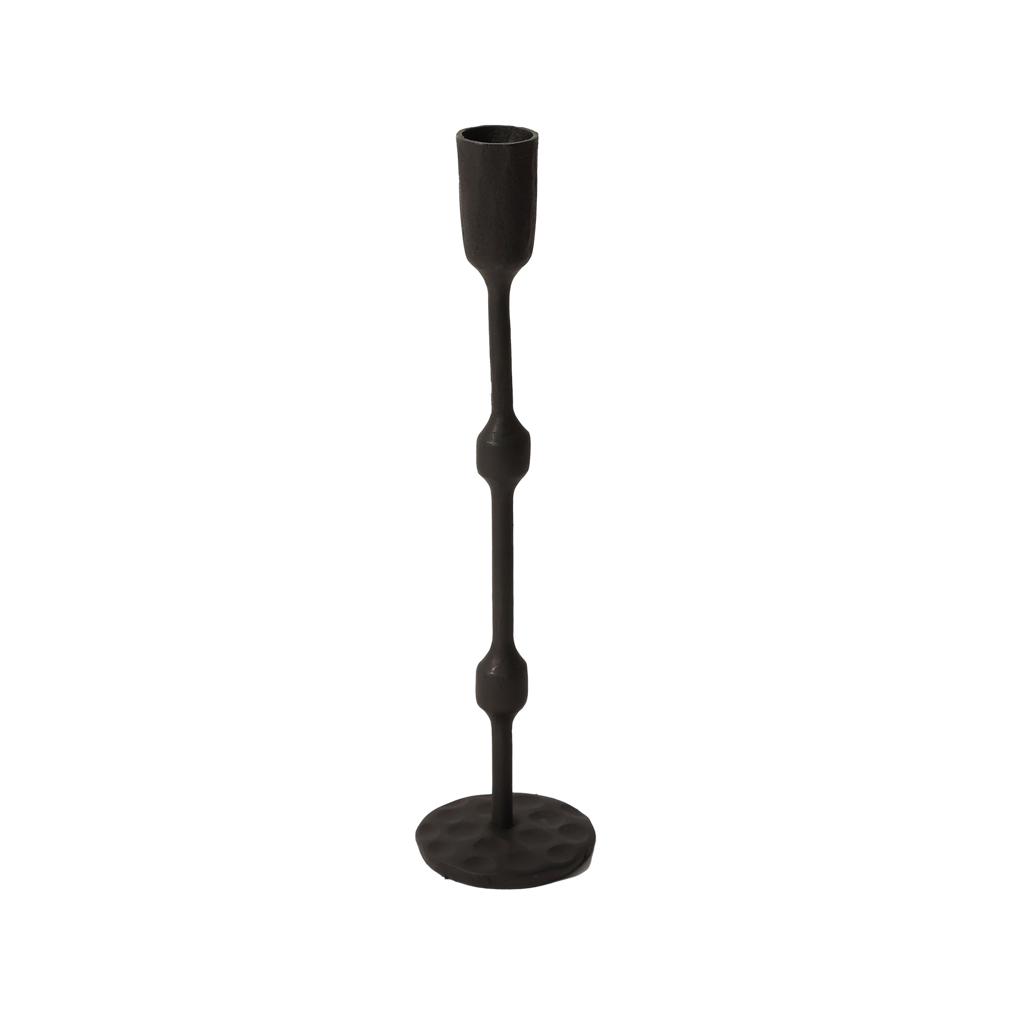 Ce bougeoir en métal noir séduit par sa silhouette élancée et son style artisanal. Son pied texturé et son corps rythmé par deux formes arrondies lui confèrent une allure sculpturale, comme façonné à la main. Parfait pour accueillir une bougie, il apporte une touche élégante et contemporaine à une table, une console ou une étagère.