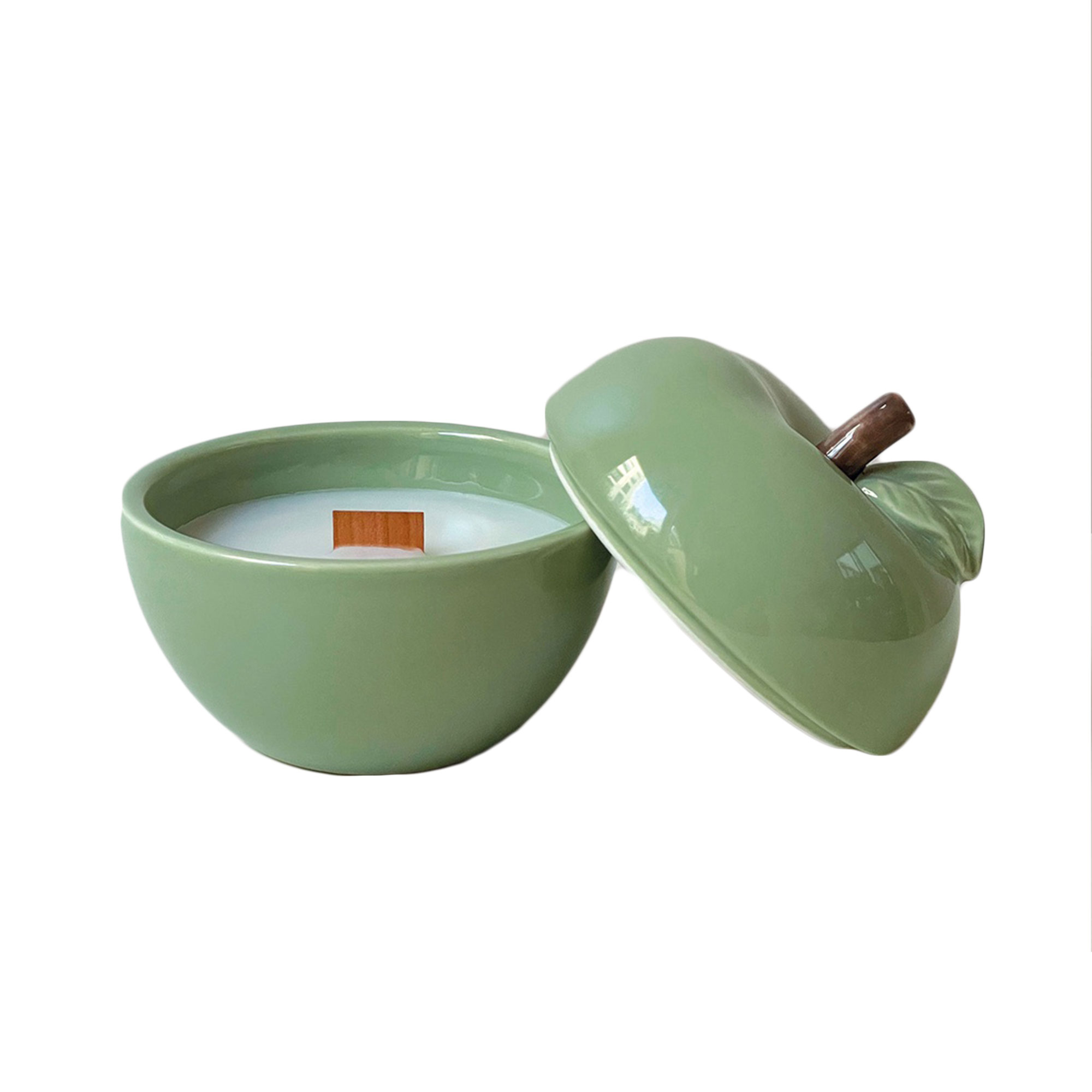 Cette bougie parfumée à la sauge est présentée dans un contenant en céramique en forme de pomme, décliné dans un coloris vert doux et apaisant. Sa finition brillante met en valeur les courbes arrondies de l’objet et lui confère une présence décorative discrète, idéale pour des intérieurs naturels ou contemporains.