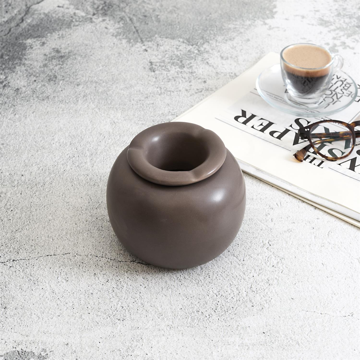 Décliné dans un coloris marron aux nuances chaudes, ce cendrier en céramique reprend des lignes douces et arrondies pour une présence discrète mais affirmée. Sa finition mate apporte une sensation minérale et naturelle, idéale pour créer une ambiance feutrée.