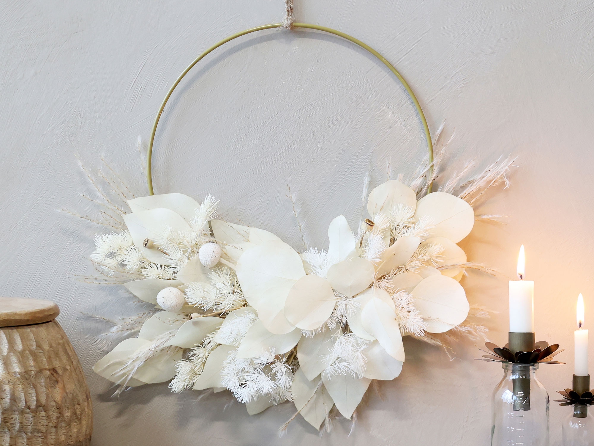 Cette couronne à suspendre en fleurs séchées naturelles blanches apporte une touche lumineuse et délicate à la décoration murale. Sa composition associe fleurs séchées, feuillages légers et graminées dans des nuances de blanc et d’écru, créant un ensemble doux et équilibré.