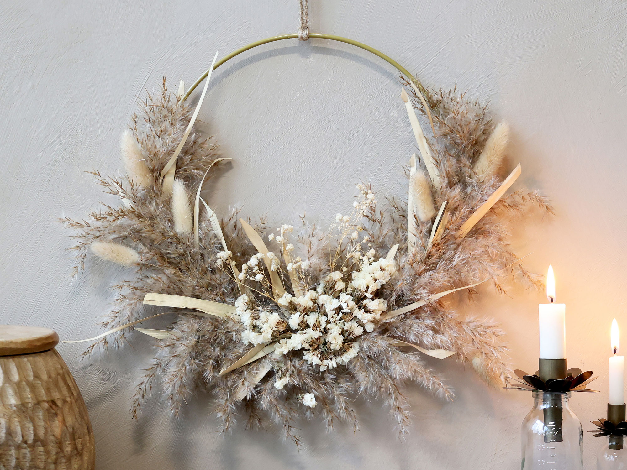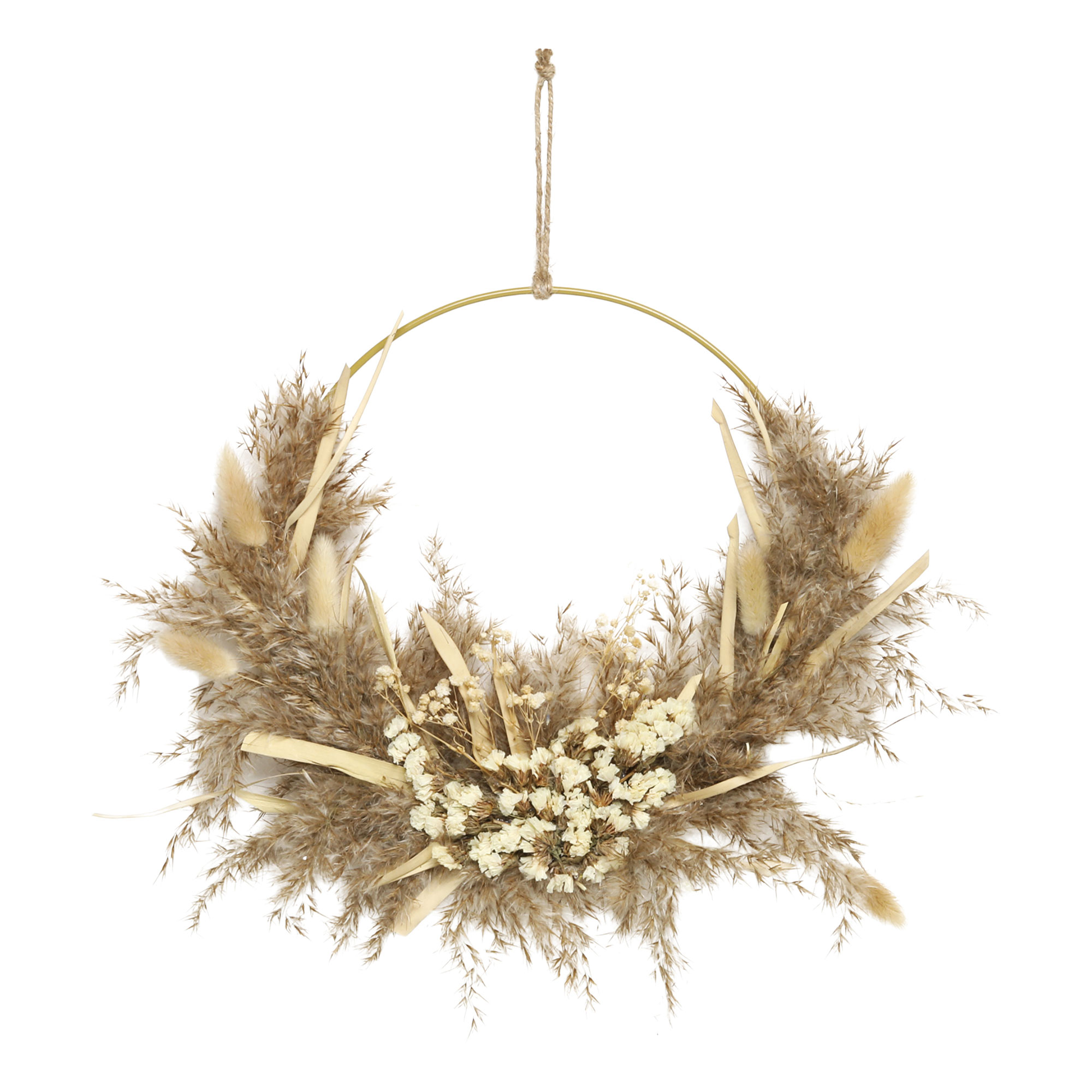 Cette couronne à suspendre en fleurs séchées naturelles apporte une touche végétale douce et équilibrée à la décoration murale. Composée de fleurs et graminées séchées aux teintes naturelles, elle joue sur les volumes et les textures pour créer un rendu à la fois chaleureux et léger.