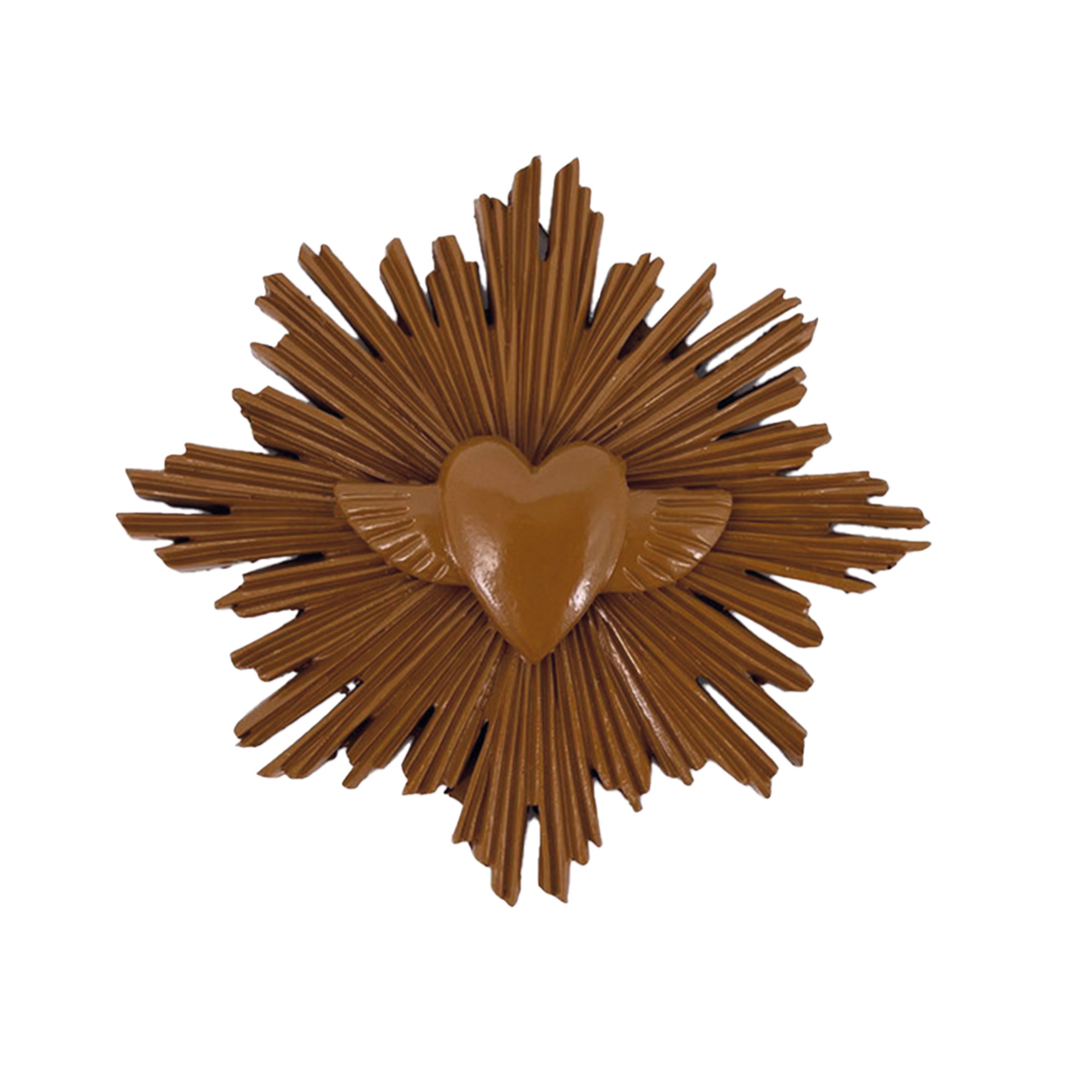 Cette décoration murale ex-voto met en scène un cœur central délicatement souligné d’ailes, entouré de rayons sculptés qui captent la lumière et donnent du relief au mur. Inspirée de l’esthétique sacrée revisitée, elle apporte une touche symbolique et décorative forte à un intérieur.