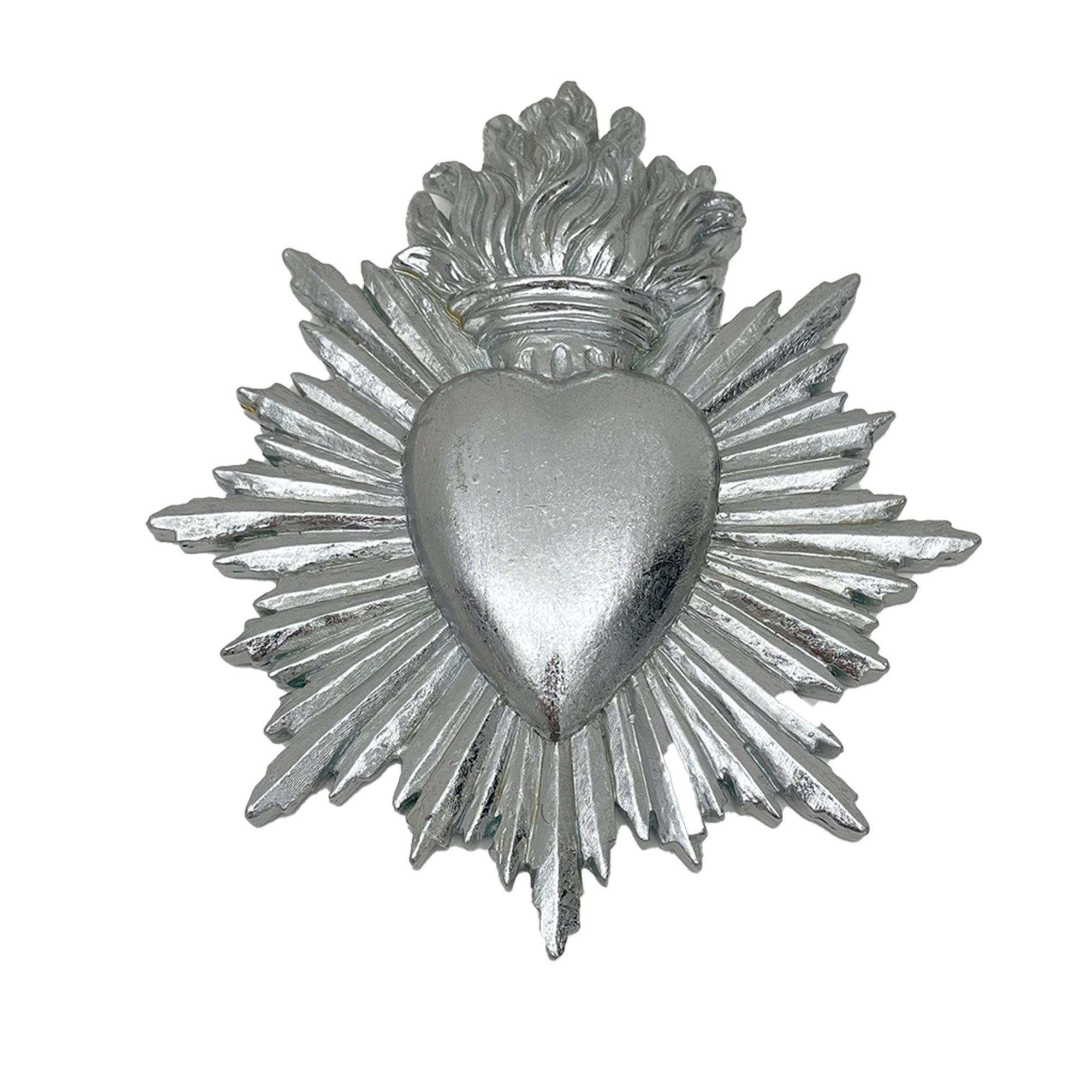 Cette décoration murale ex-voto en forme de cœur se distingue par sa finition argentée, lumineuse et texturée. Inspirée des objets symboliques traditionnels, elle capte la lumière et crée un point d’accroche visuel fort sur le mur.
