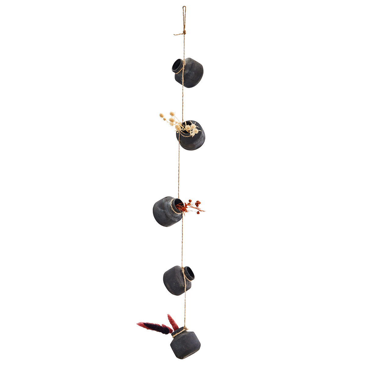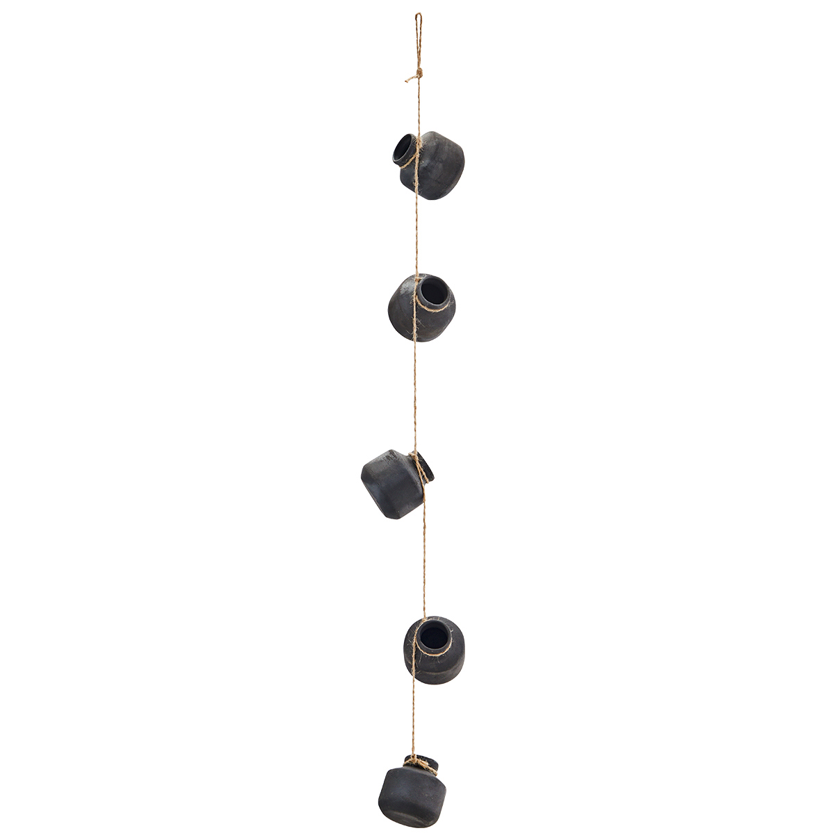 Cette guirlande de poteries en terre cuite noire apporte une touche artisanale et brute à votre décoration. Suspendus sur une corde naturelle, les petits pots en argile créent un jeu de volumes et de textures qui capte immédiatement le regard.