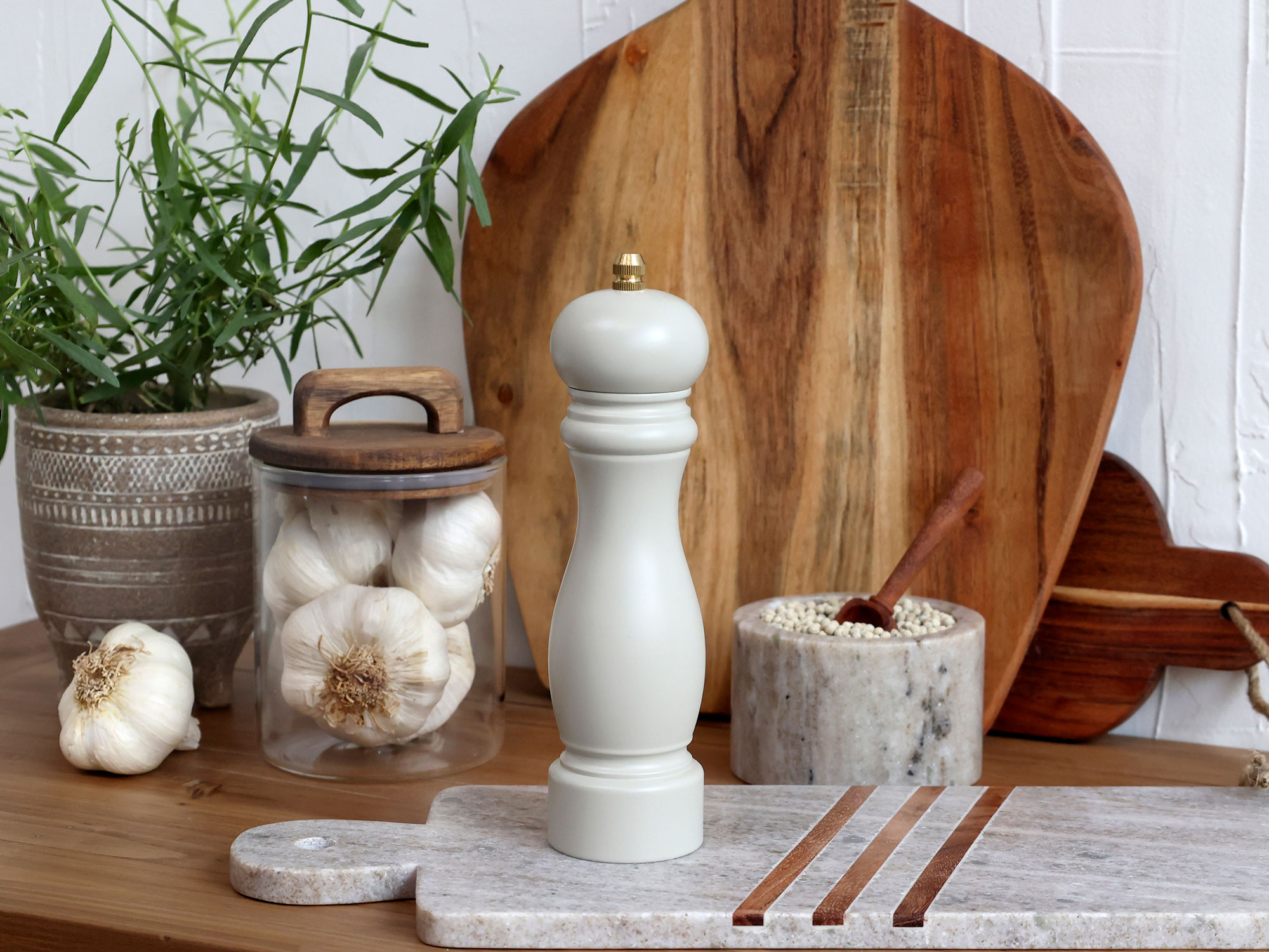 Ce moulin à sel ou poivre en bois séduit par sa finition gris mat, sobre et contemporaine. Son design épuré en fait un accessoire aussi décoratif que fonctionnel, parfaitement à sa place sur un plan de travail, une étagère ou une table dressée avec soin.