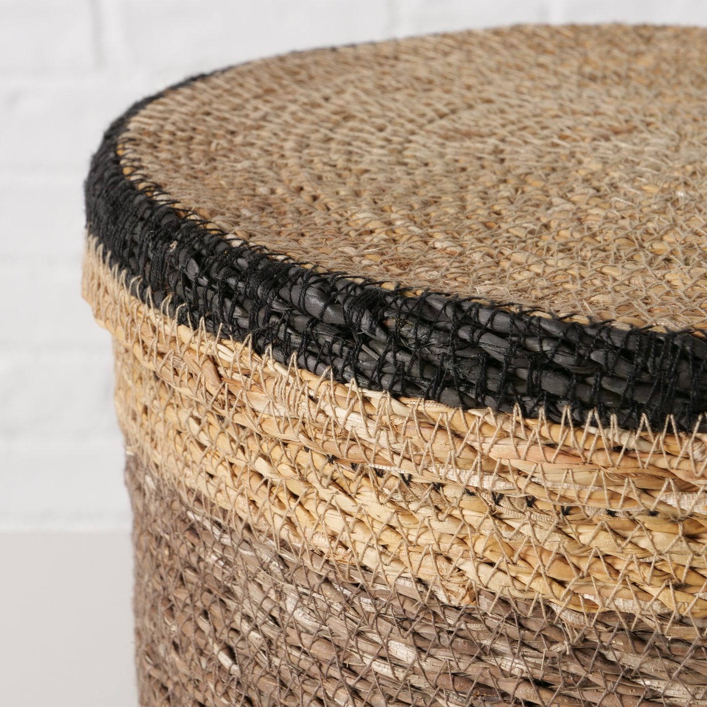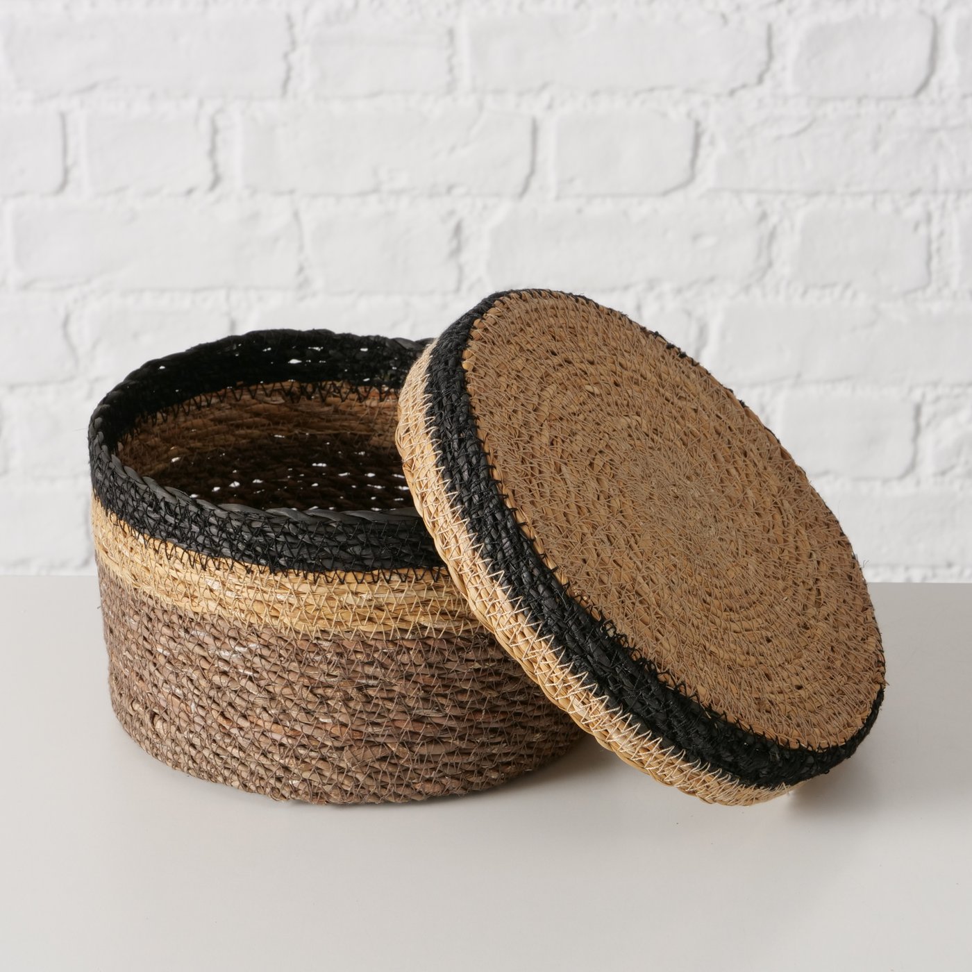 Cette panière ronde en fibres naturelles allie praticité et esthétique grâce à son tressage artisanal et son élégant dégradé de tons bruns souligné par une bordure noire. Son couvercle assorti permet de dissimuler vos objets tout en apportant une note décorative chaleureuse à votre intérieur.