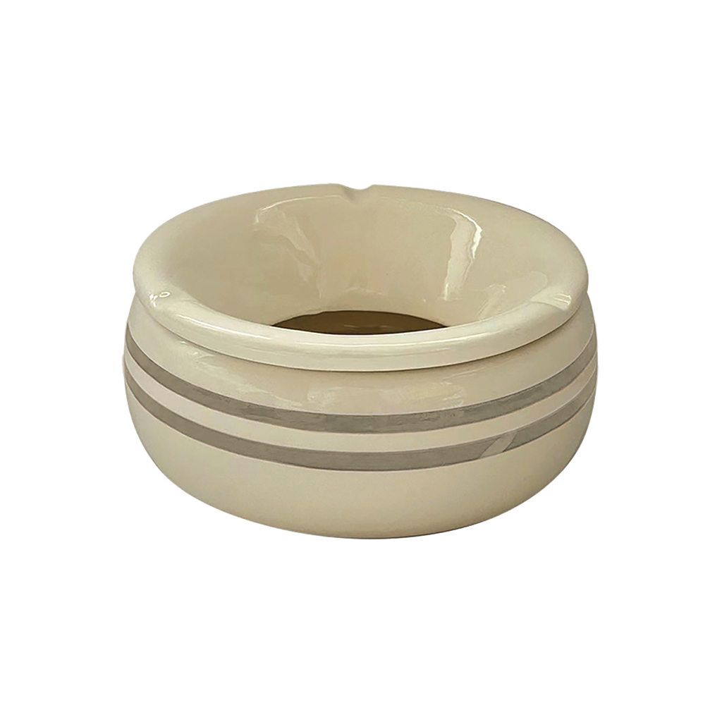 Ce cendrier en céramique se distingue par son décor de fines rayures beiges qui viennent rythmer une base blanc crème à la finition brillante. Un jeu de contrastes discret, pensé pour apporter une touche graphique tout en restant parfaitement équilibré.