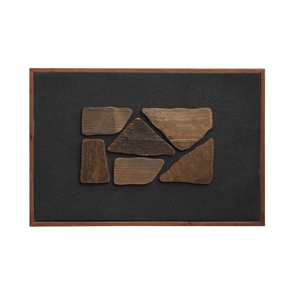Ce tableau rectangulaire met en scène un ensemble de fragments de bois recyclé, aux formes irrégulières et aux nuances naturelles, disposés comme une composition abstraite. Le contraste entre ces pièces chaleureuses et le fond noir texturé crée un jeu visuel puissant, à la fois brut et élégant.