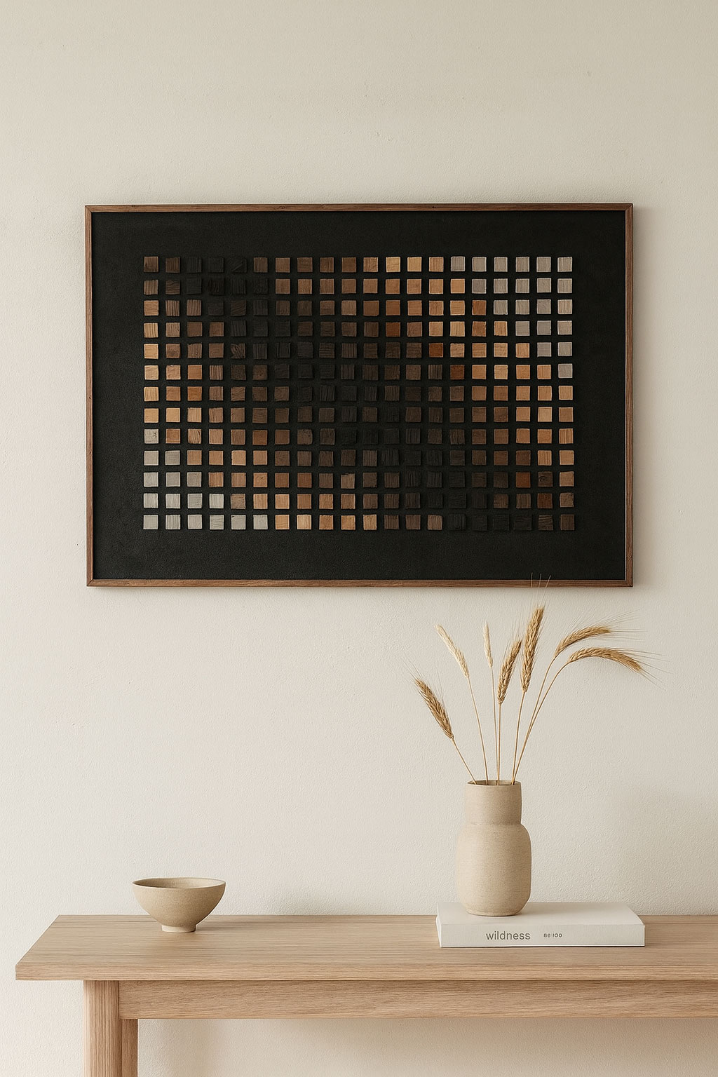 Ce tableau rectangulaire joue sur les contrastes et les textures grâce à une multitude de petits cubes en bois recyclé, soigneusement disposés pour créer une mosaïque vibrante. Chaque pièce de bois, laissée brute ou légèrement patinée, révèle ses nuances naturelles : miel, tabac, ébène, sable… Un jeu de couleurs organiques subtilement rythmé qui donne vie à la surface.