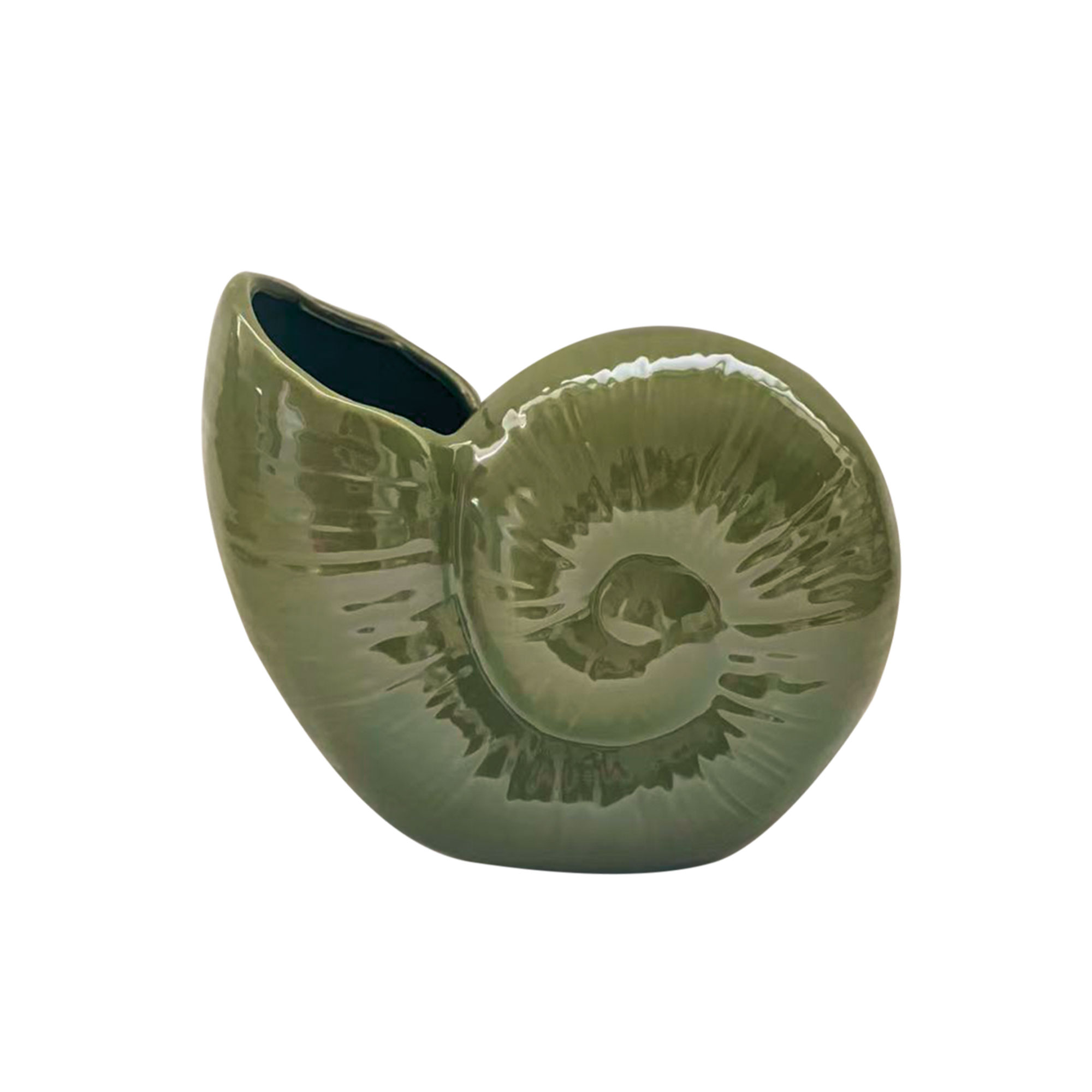 Ce vase décoratif en céramique verte attire le regard par sa forme organique inspirée du coquillage et par sa finition brillante aux reflets nuancés. Ses lignes sculpturales apportent du relief et du mouvement, tout en conservant une lecture visuelle douce et équilibrée.