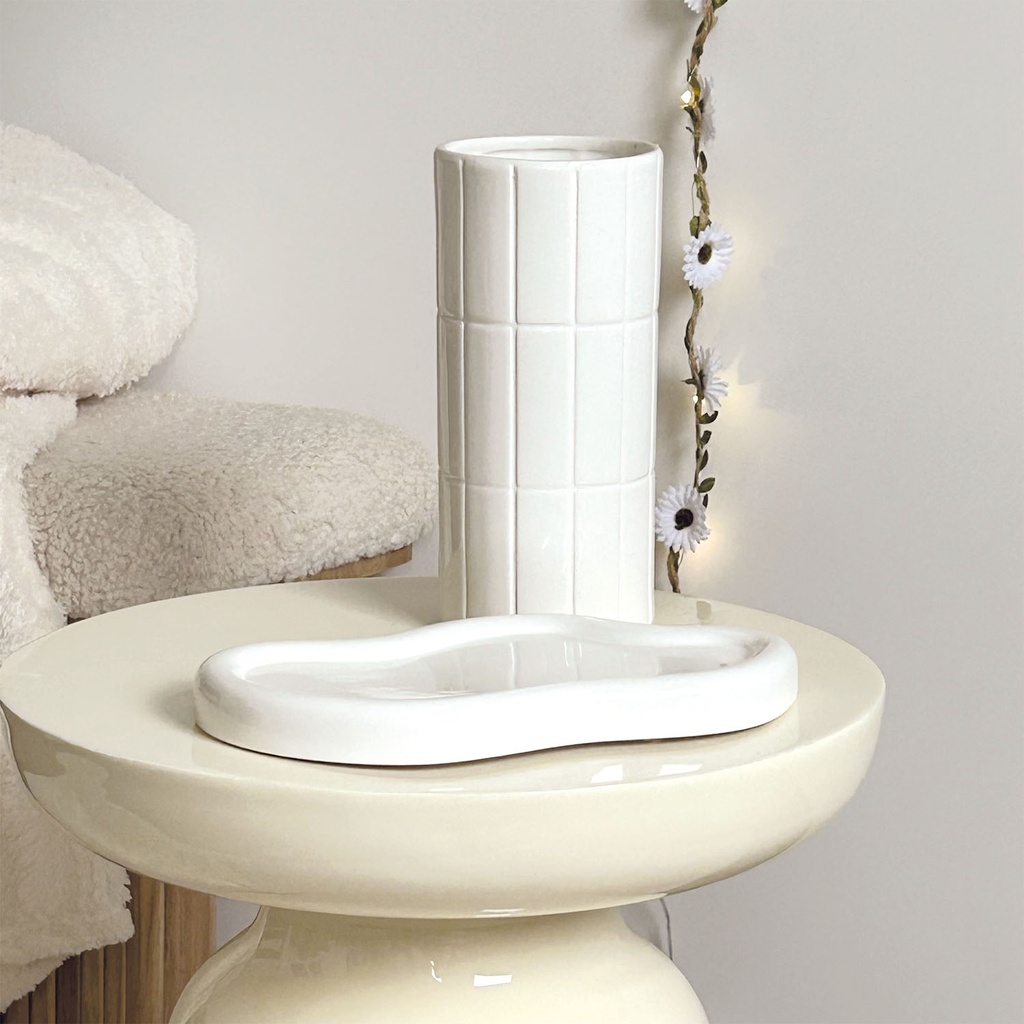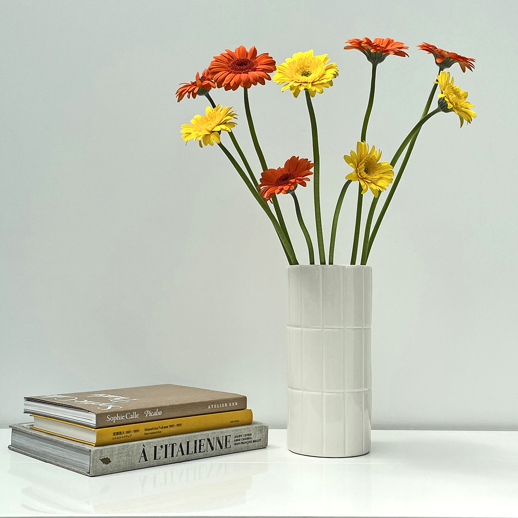 Graphique et minimaliste, ce vase en céramique blanc séduit par son motif effet carrelage délicatement structuré. Ses lignes verticales et horizontales créent un relief subtil qui apporte du rythme tout en conservant une grande sobriété.